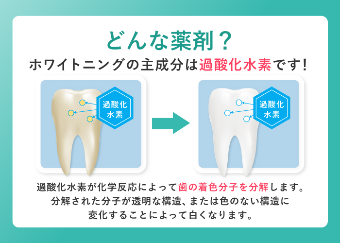 DENNOVATE(ディノベート)は、歯の白さだけでなく口内環境全体に配慮したホームホワイトニングで、ホワイトニングジェルに含まれている過酸化水素の働きによって、歯に沈着している色素を分解していくことで、白い歯になっていきます。