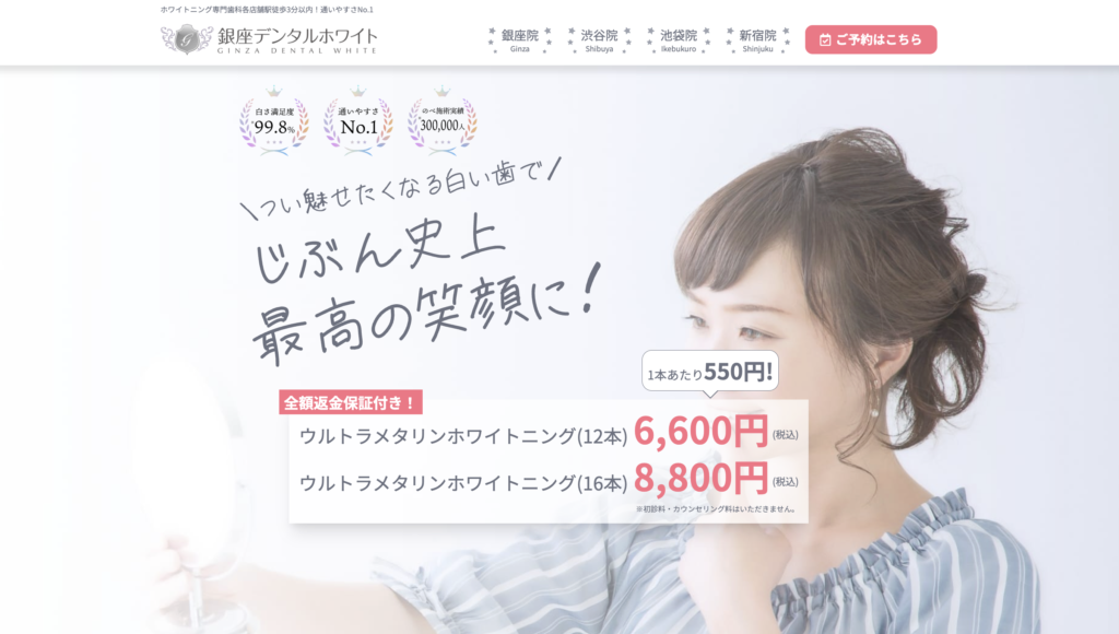 その点、銀座デンタルホワイトは「1本550円」という手軽な料金体系でありながら、ホワイトエッセンスのような高い専門性と、スターホワイトニングのような通いやすさを兼ね備えています。