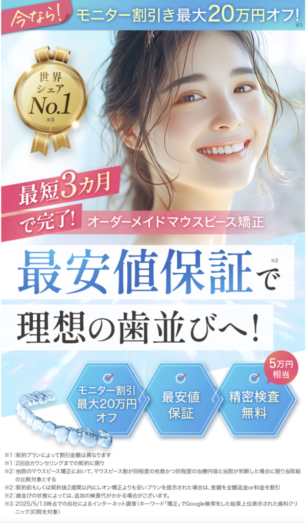 レオン矯正は、最短3カ月で完了するマウスピース矯正です。最安値保証をしているレオン矯正では、5万円相当の精密検査が無料になる点や、モニター割引なども利用できる点が支持を集めています。