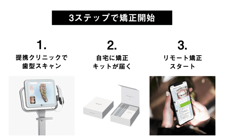 クリニックにて初回診断を行ってもらい、自宅にて理想の歯並びをシミュレーションで見られます。その後自宅にマウスピース矯正のキットが届くので、自宅にいながら矯正をスタートできます。